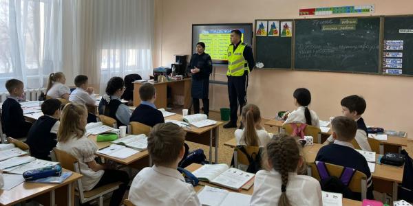 Участковый инспектор ювенальной полиции УП г Рудного- Ашыкбаева Т.А. и инспектор роты патрульной полиции УП г. Рудного старший лейтенант полиции Мурсалов Жанибек Раушанбекулы провели профилактическую беседу с учащимися начальных классов на тему «Опасные ситуации...